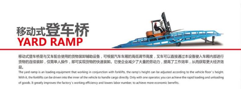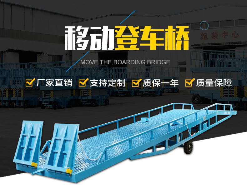 移动式登车桥是用于卡车装卸货时,叉车从地面行驶至车厢的过渡桥梁。它的可移动性,可满足在不同场地进行装卸作业。