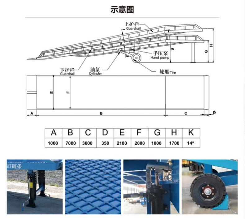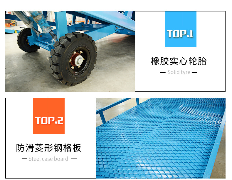 由高度锰钢矩形管制作的承重梁,有着极高的刚性。坡面采用齿形钢格板制作,具胡卓越的防滑性能。机身材料经过抛丸除锈处理,并采用耐腐涂料油漆,具有更好的耐锈效果。采用手动泵作为起升动力,不需外接电源,方便室外使用。